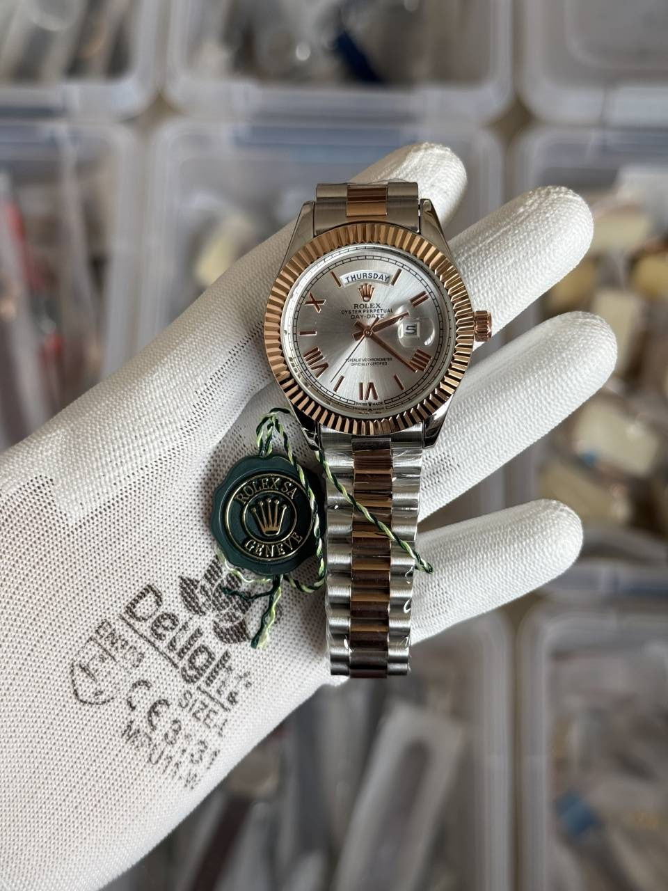 Materials: The watch combines stainless steel (Oystersteel) and Everose gold (Rolex's proprietary rose gold alloy), a two-tone style. Day-Date models are exclusively made of precious metals (gold or platinum), meaning the case and outer links would be gold.